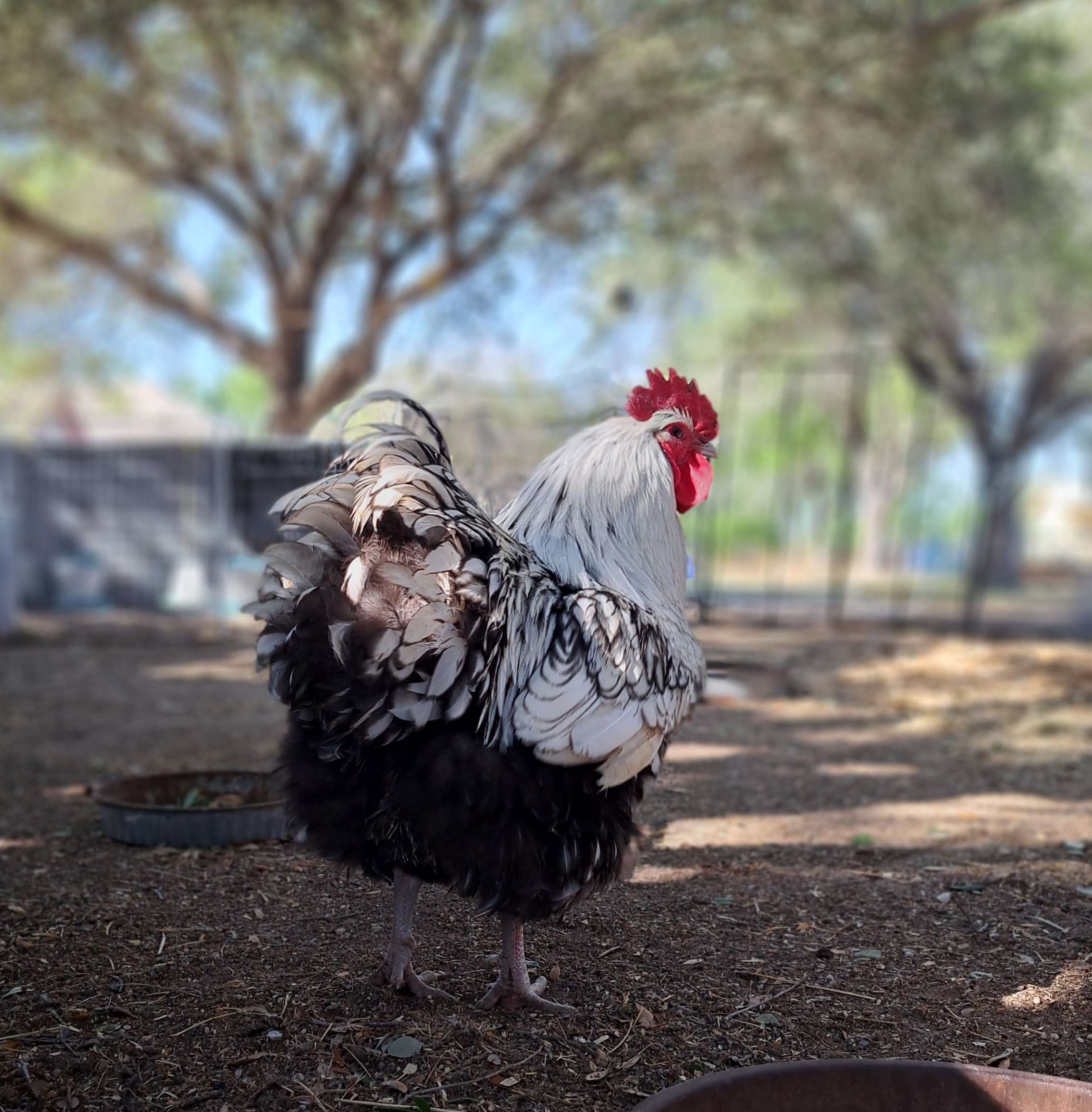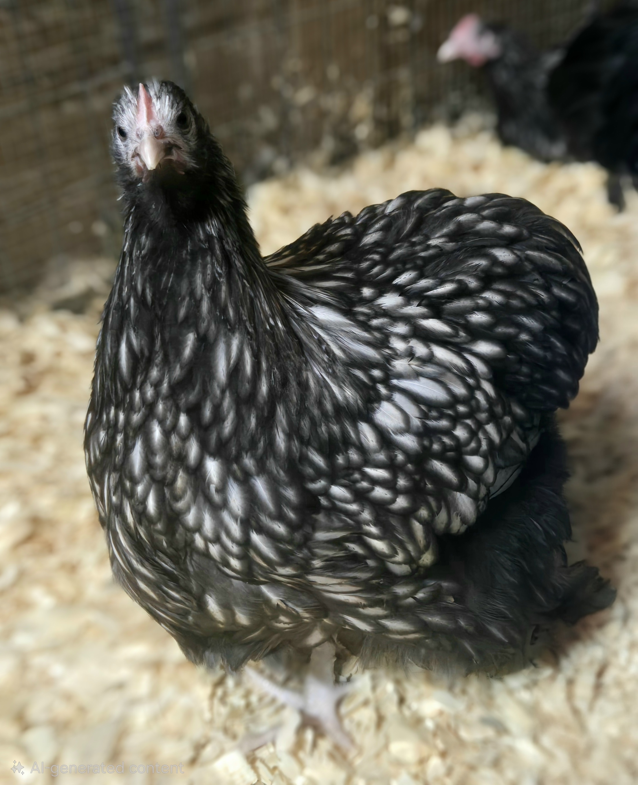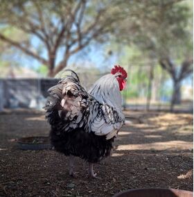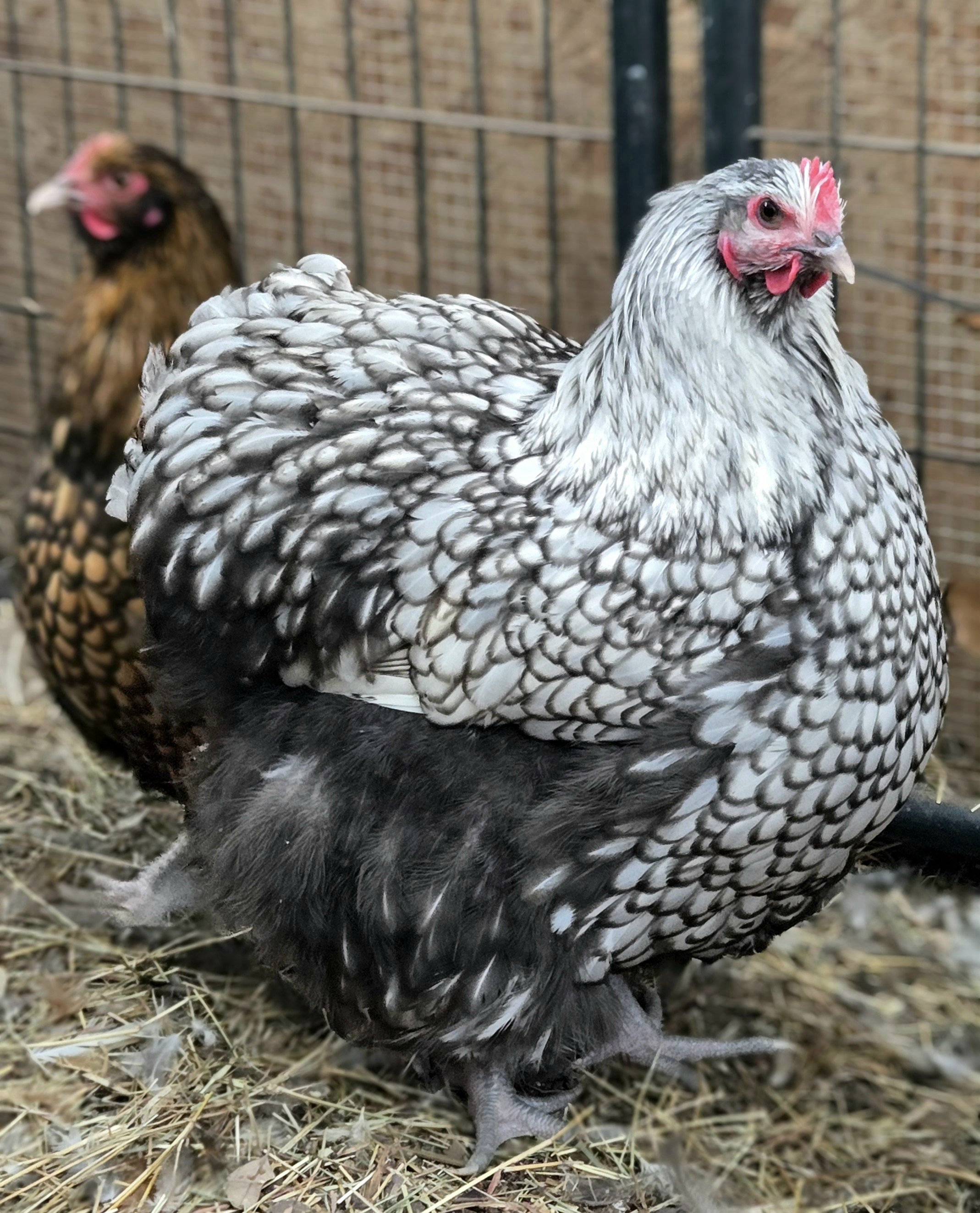 Silver Laced English Orpington: Dressed as if for a royal ball, Silver Laced English Orpingtons have an intricate and elegant lacing of silver on their feathers. They're known for their serene and friendly nature.